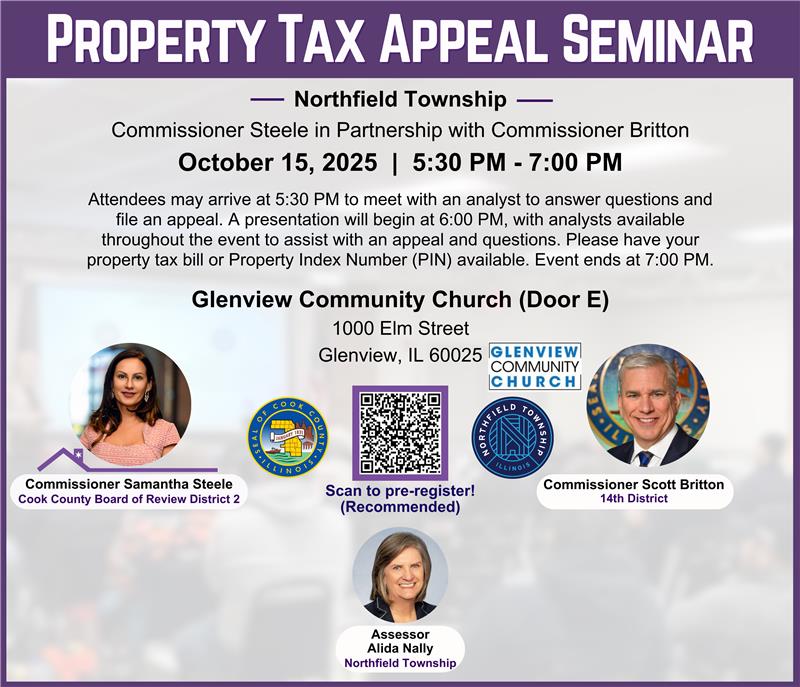 Northfield Township residents, join us for a property tax appeal workshop co-sponsored by Cook County Board of Review District 2 Commissioner Samantha Steele and 14th District Cook County Commissioner Scott Britton.