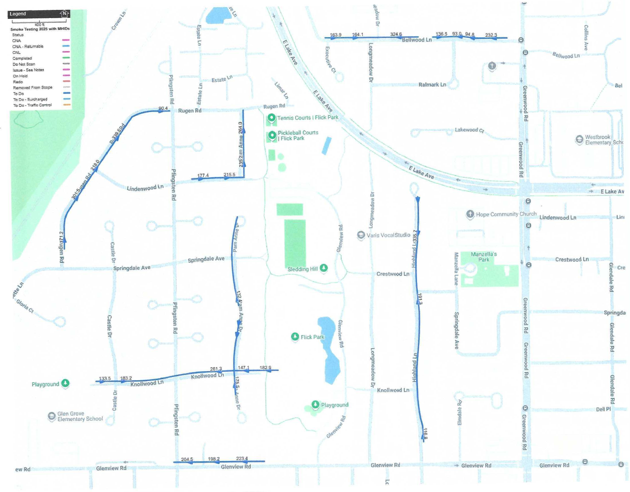 Beginning the week of OCTOBER 13, 2025, representatives from Duke’s Root Control, Inc. (“Duke’s”) will be evaluating the condition of the sanitary sewer system and private sewer service laterals. Crews will be evaluating the sewer mains and laterals through smoke testing, which is a process in which non-toxic, non-flammable liquid smoke is pressurized through the sewer mains. Defects within the system are noted for repair by the crews. The pink door tags that Duke’s will be placing on your door two to three days prior to the test, gives more insight on the process and what you can do to prepare. You do not need to be present for the test.